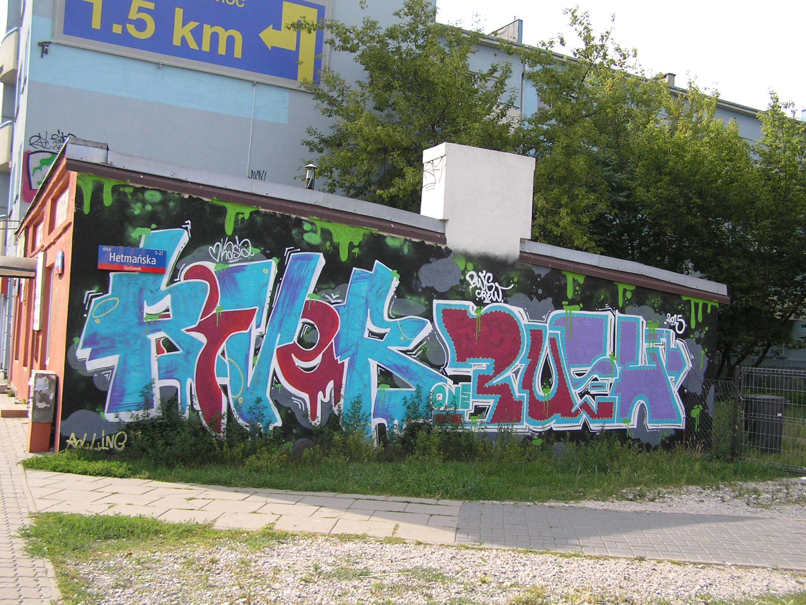 Kolorowe graffiti zostało wykonane na murowanej ścianie budynku od strony ulicy Hetmańskej w połowie 2015 roku.