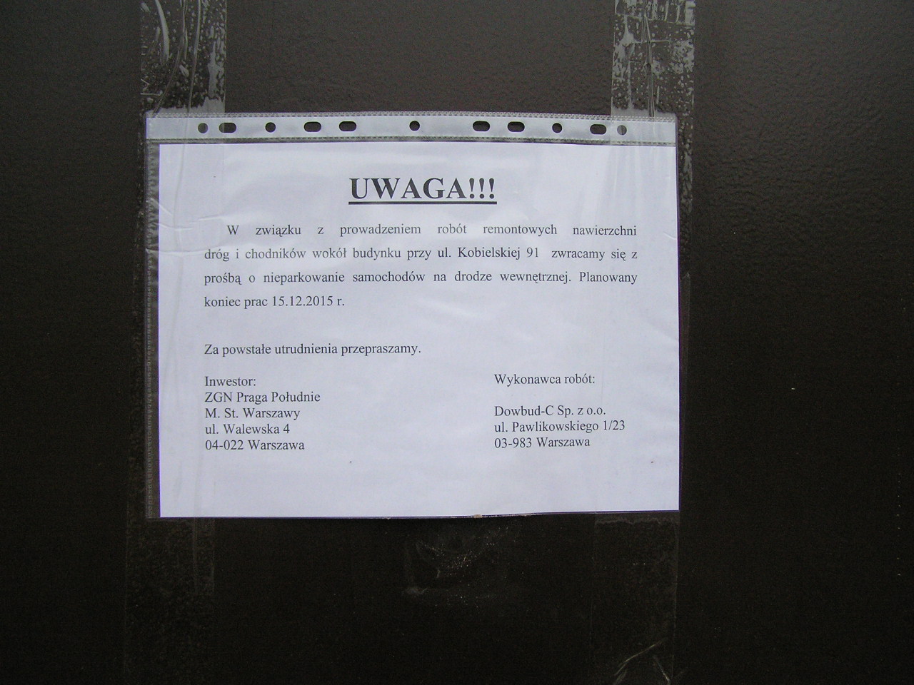 Trwająca obecnie wymiana nawierzchni ulic i chodników w obrębie budynku przy ulicy Kobielskiej 91 zakończy się w połowie grudnia br. Wykonawcą remontu jest spółka DowBud.