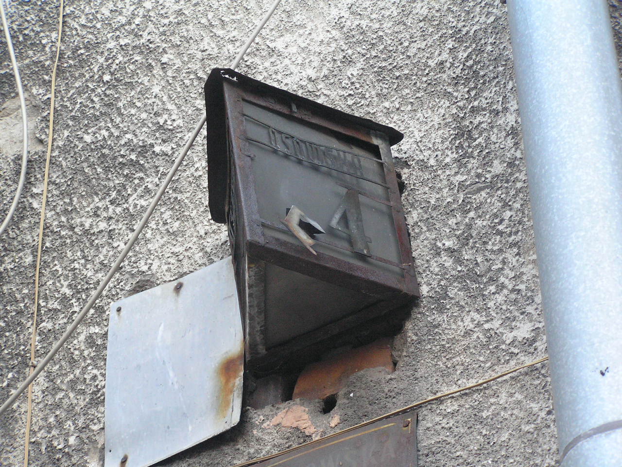 Nieco zniszczona latarenka umieszczona na ścianie budynku.
