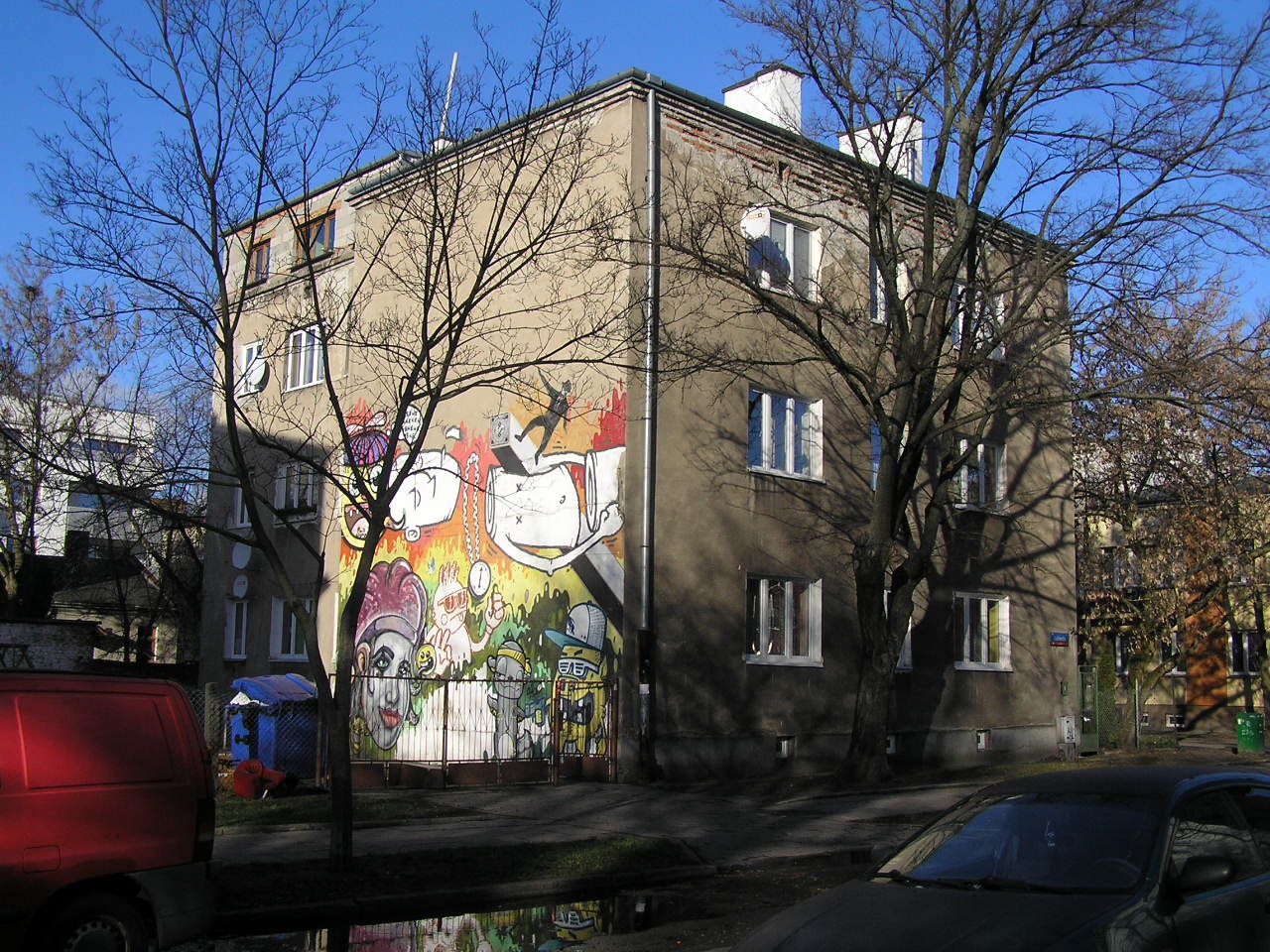 Mural nieznanego autorstwa powstał na ścia­nie kamienicy od strony podwórka około 2011 roku.